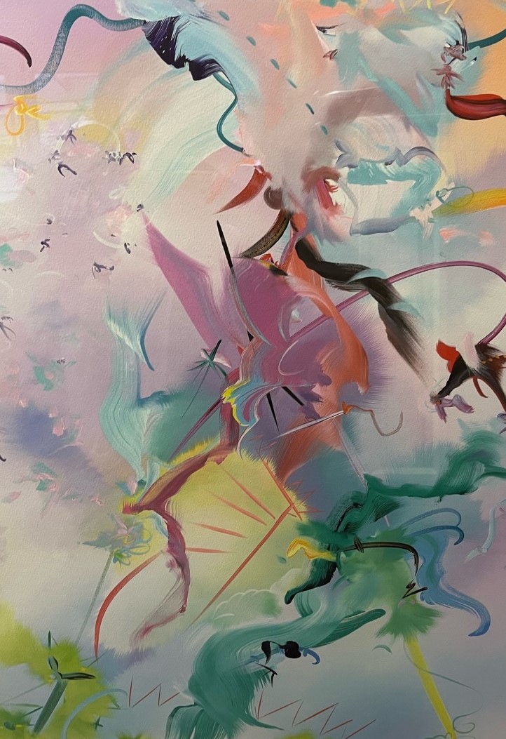 Many-coloured messenger seeks her fortune, 2017 by Fiona Rae. Fiona Rae is an abstract artist from Hong Kong and she exhibited her work in 1988 in an exhibit organised by Damien Hirst. Rae’s paintings are known for their inventive uses of colour, line, imagery and gesture.