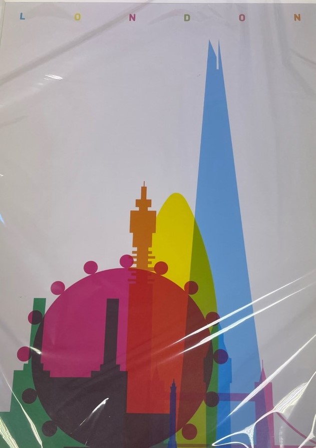 Print of London Skyline by Yoni Alter. Yoni Alter is an Israelian artist. The print includes The Shard, The Gherkin, BT Tower, London Eye, Battersea Power Station, Tower Bridge, Big Ben, Nelson's Column and The New Bus for London.